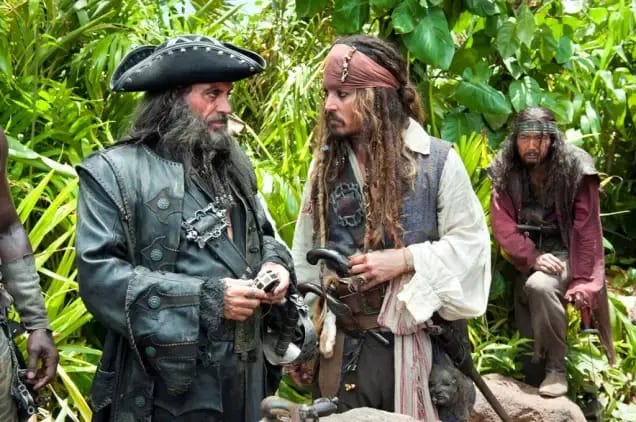 Parece o Barba Negra em Piratas do Caribe: Navegando em Águas Misteriosas.